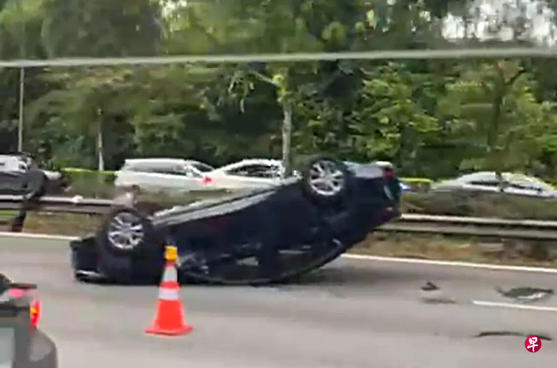 武吉知马快速公路发生车祸,涉及两辆轿车与两辆电单车,其中一辆轿车翻覆四轮朝天,两人送院。
