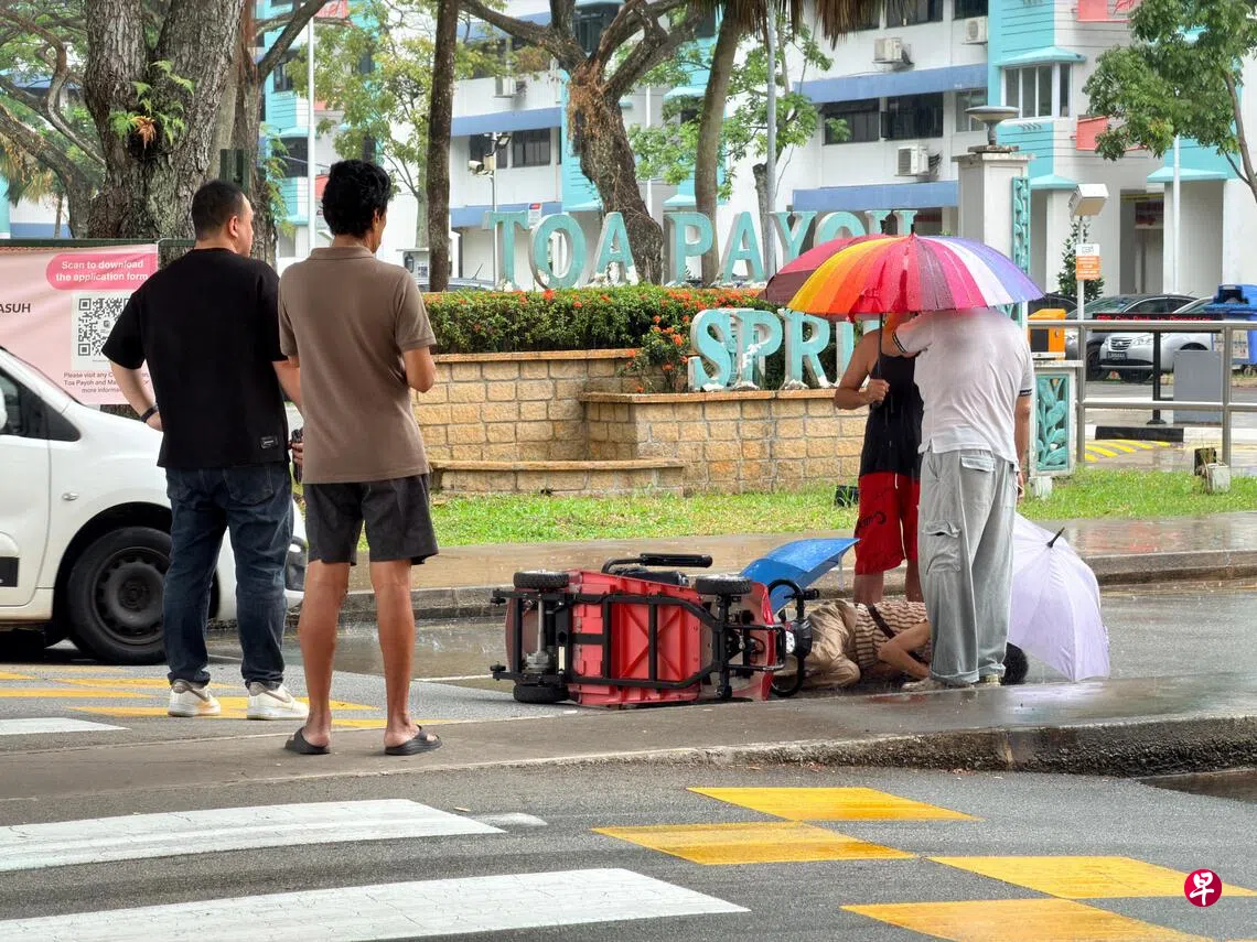 这起车祸发生在星期五(10月17日)下午约2时15分,地点在大巴窑北路靠近新报业媒体大楼附近的人行道。《联合早报》记者路过时,发现一名身着条纹衬衫的男子卧倒在地上,身旁还有一辆翻倒在地的个人代步工具(PMD),路前方则停着一辆红色丰田汽车。