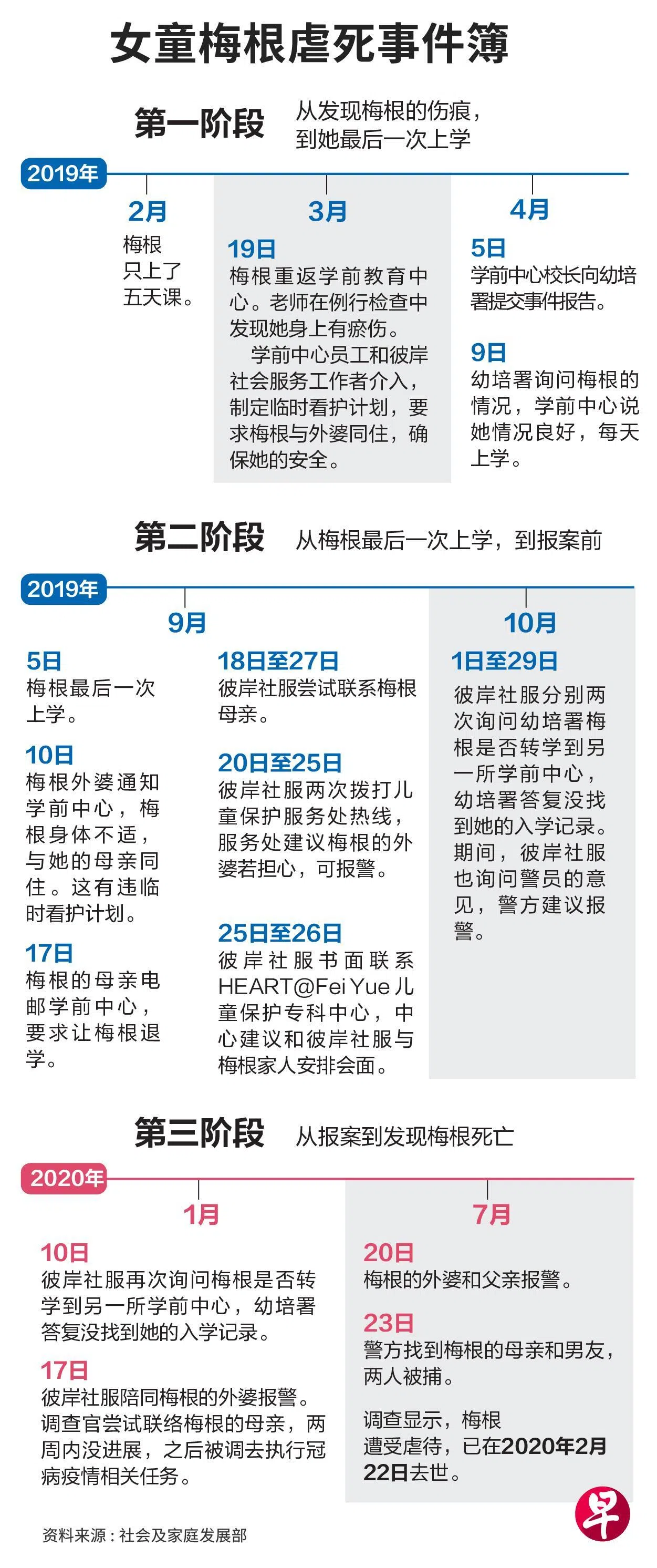 梅根的外婆和父亲同年7月20日再次报警,警方7月23日将梅根的母亲符丽萍与男友逮捕。但梅根已在2月22日离世,生前惨遭虐待,尸体被烧。