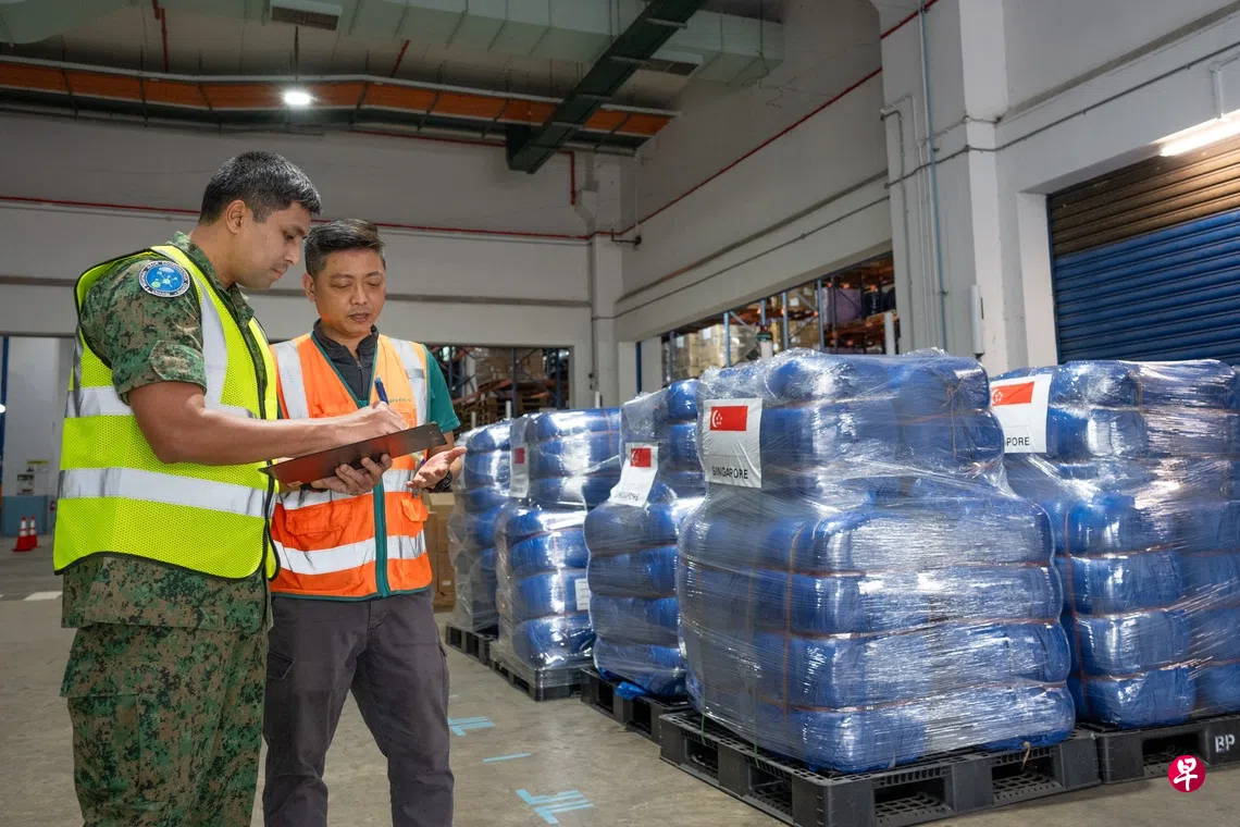 超过五公吨的人道主义援助物资包括保温毯和卫生用品,由新加坡武装部队和非政府组织CHARIS提供,以支持灾民的生存需求。