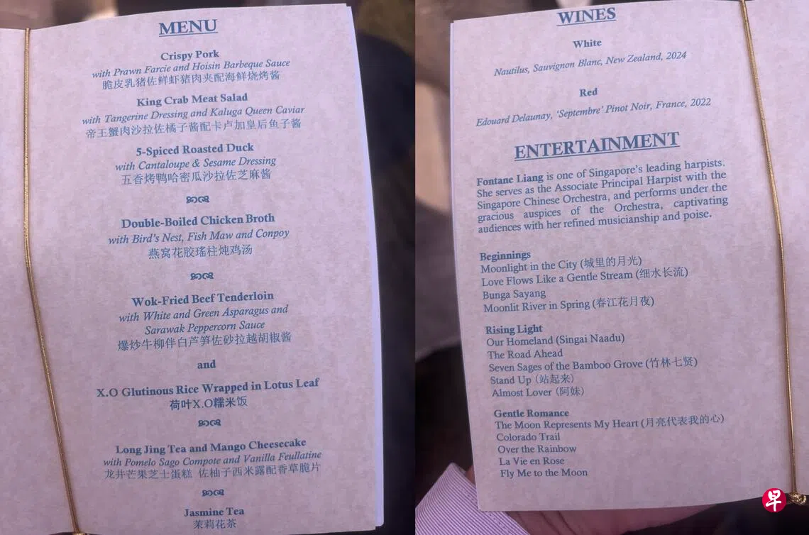 脆皮乳猪、五香烤鸭、龙井芒果芝士蛋糕……黄循财总理星期六(10月25日)晚为来访的中国国务院总理李强设正式晚宴,以七道菜肴款待约80位来自新中两国的政要和其他嘉宾。
