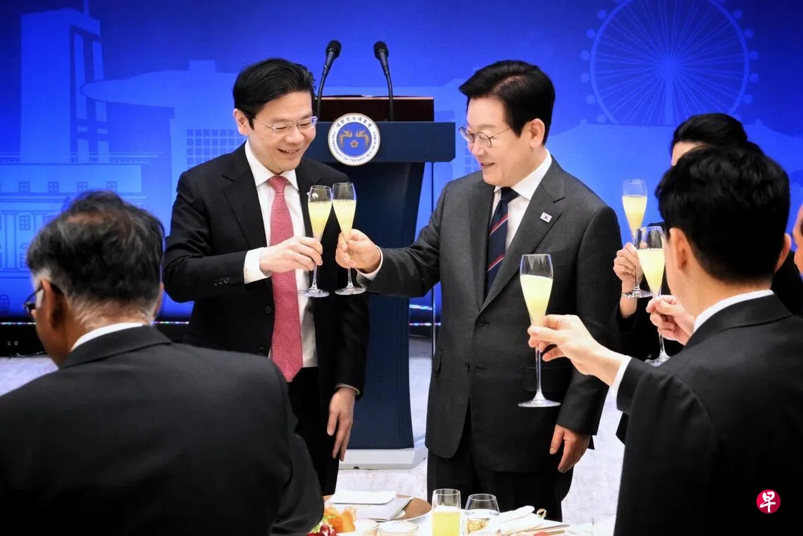 济州带鱼、韩式牛肉饼、还有韩国干柿子配上咖椰酱蛋糕……我国总理兼财政部长黄循财星期天(11月2日)正式访问韩国首尔时,韩国总统李在明设午宴招待黄总理一行人,午宴菜肴在浓郁韩风中,夹带一丝新加坡南洋风味。