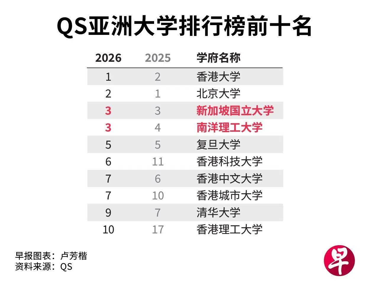 国际教育市场咨询公司Quacquarelli Symonds(简称QS)星期二(11月4日)公布了2026年亚洲大学排名。南大攀升一位,与国大并列第三;新加坡管理大学上升18位,排名第122;新加坡科技设计大学则下降16位,位列第169。