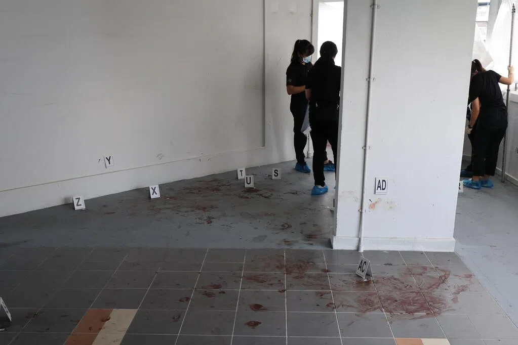 《联合早报》记者约中午12时抵达现场,观察到这座组屋的多个楼层,包括4楼、15楼至19楼共六层被警戒线封锁,17楼地上有大滩血迹,楼梯和扶手上都有血迹。