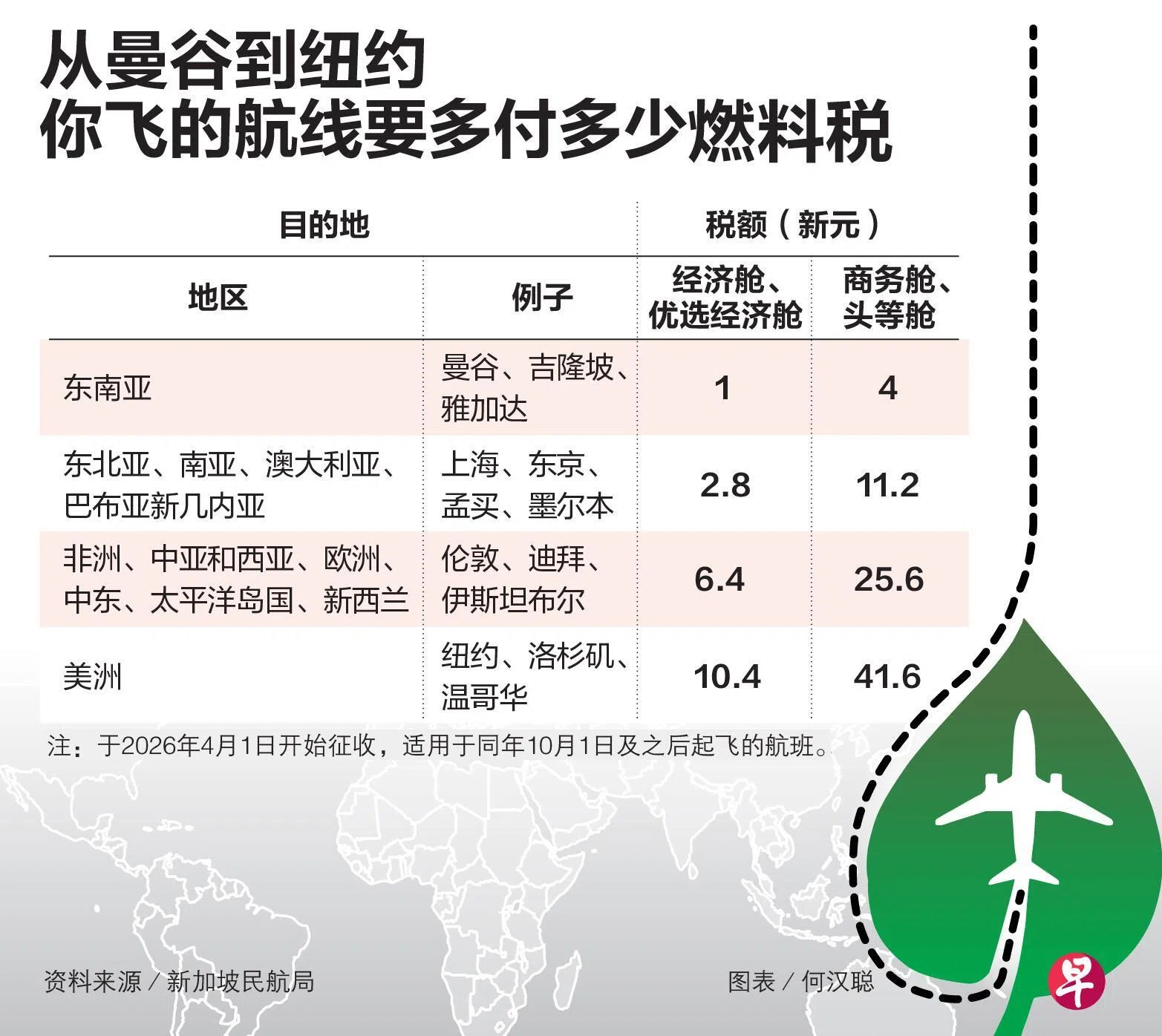从2026年10月1日起,从新加坡出发的航班机票价格将略有上调。经济舱乘客每张机票须额外支付1元至10元4角不等的“可持续航空燃料税”,以支持航空业减碳转型。
