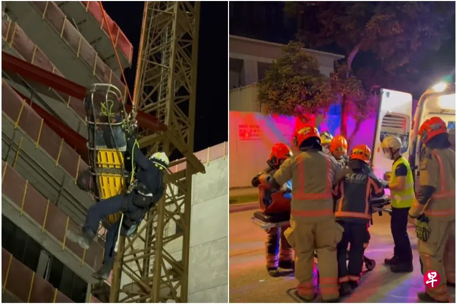 工人操作塔式起重机时突感不适,新加坡民防部队展开高空救援行动,将这名进行高空作业的工人安全送回地面。
