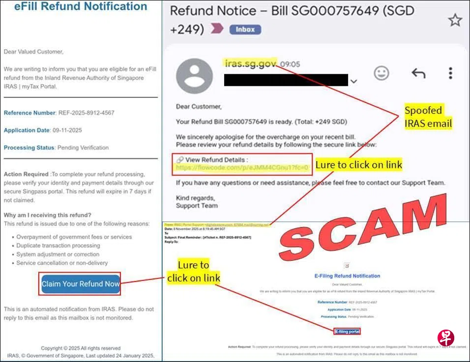 税务局(IRAS)星期五(11月14日)发声明说,当局接获公众举报,指诈骗邮件会以提供“退税”为诱饵,诱导纳税人点击可疑链接,要求他们提供信用卡资料。