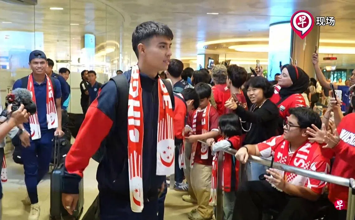 球队今天回国,《联合早报》到机场迎接他们回国,第一时间送上祝福。
