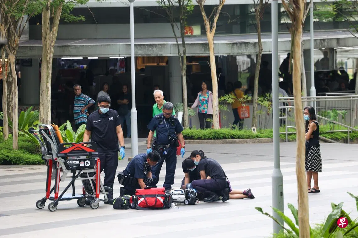 这起事件发生在星期四(11月27日)下午3时35分。《联合早报》摄影记者经过事发地点,目睹妇女倒地不起,公众纷纷上前帮忙。一名公众当时就用手持风扇为妇女散热,一些公众则帮忙电召救护车。