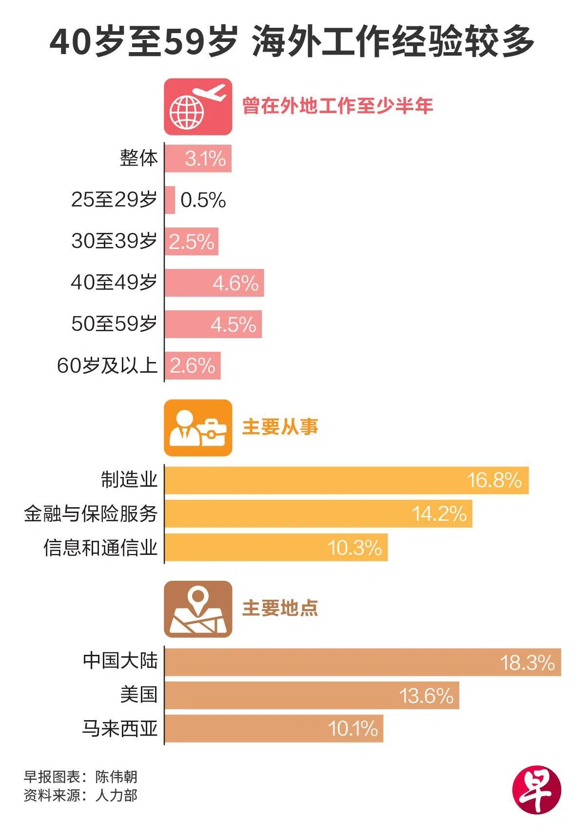 数据显示,40岁至49岁的居民中,约有4.6%曾在海外工作,50岁至59岁则是4.5%。这两个群体中,有超过一半是在25岁至34岁时,首次到海外工作。