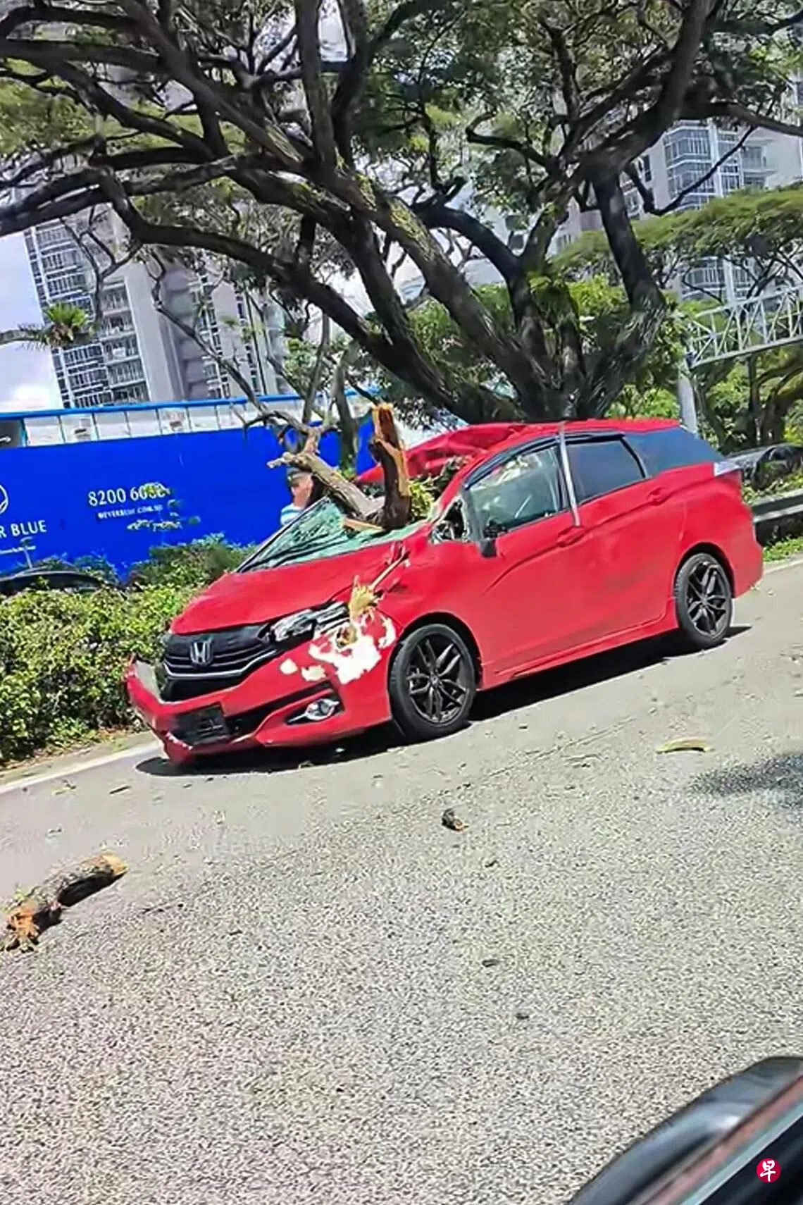 国家公园局道路景观处高级署长胡朝胜答复《联合早报》询问时说,当局星期六下午约2时接获通报,一辆行驶在第一条车道、车身较高的车子撞上雨树树枝,导致树枝折断掉落,砸中后方在第一和第二条车道行驶的汽车。障碍物已在下午约3时30分清除。公园局正联系受影响的人。