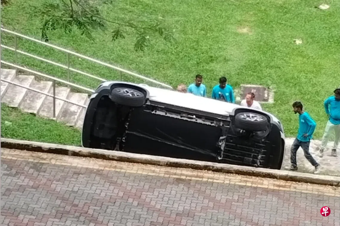 她跑到窗口一看,发现一辆白色汽车在下坡时,疑似打滑侧翻,掉落在斜坡旁的人行道上。