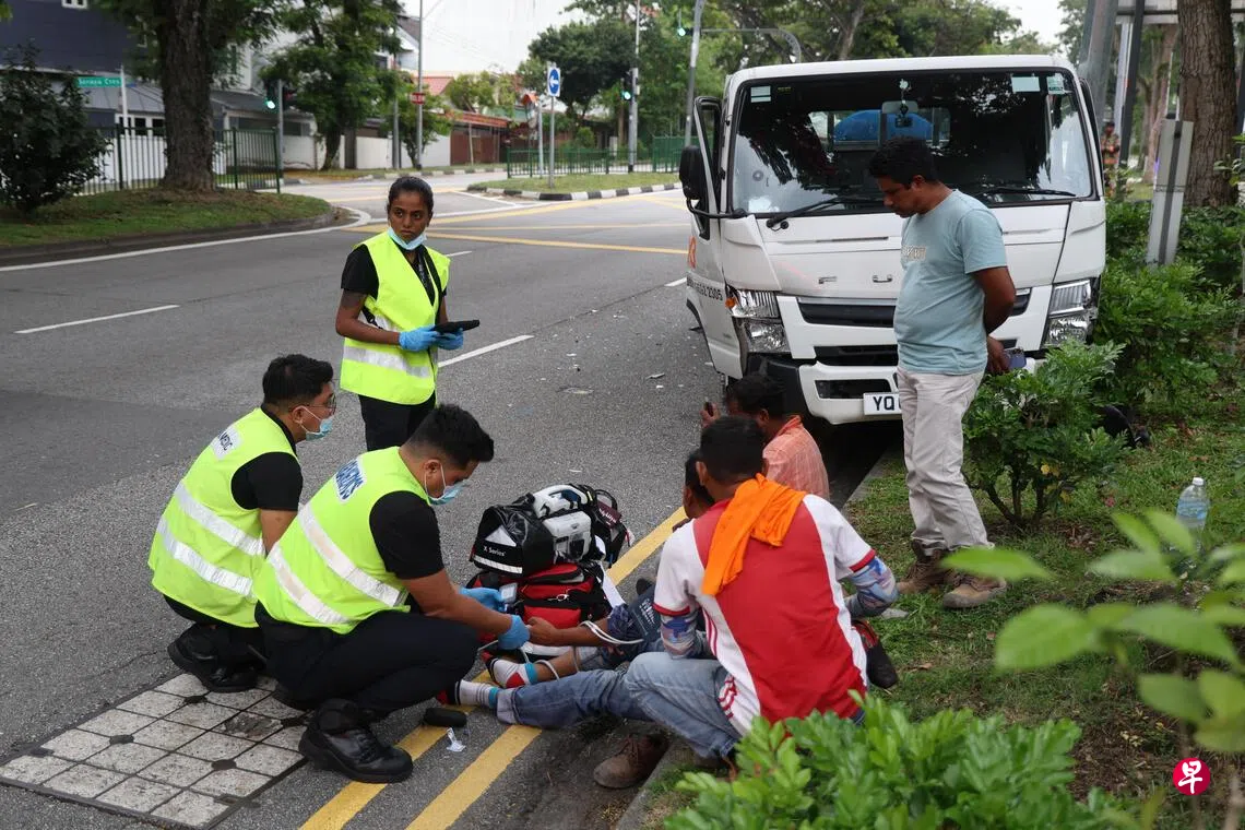 《联合早报》摄影记者星期一下午4时45分路过意外地点,看见三辆救护车、一辆消防车和一名交警。涉事的车辆是一辆雷克萨斯(Lexus)汽车和一辆罗厘。