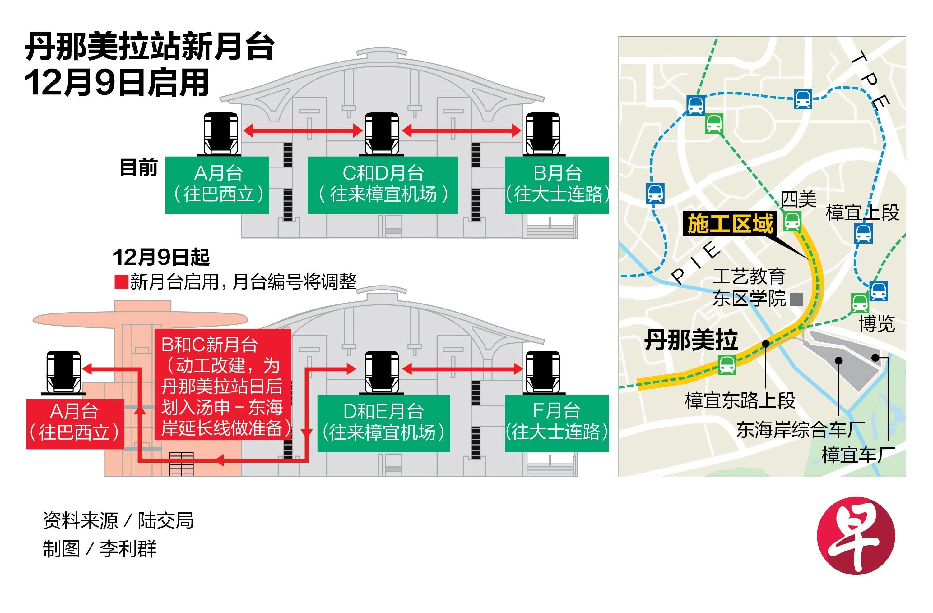 新月台将在下星期二启用,到时乘客从樟宜机场或博览站搭东西线前往四美、淡滨尼和巴西立站,须在丹那美拉站下车后,搭电梯或电动扶梯下到转换层,再前往新的月台续程。
