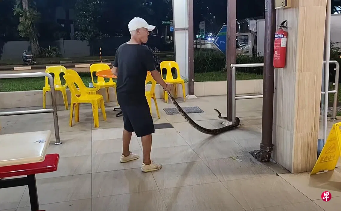 当时,有一名戴着白色帽子的阿叔出现,紧随蟒蛇,随后还成功抓着蟒蛇的尾巴,而蟒蛇受到惊吓后,奋力逃脱。