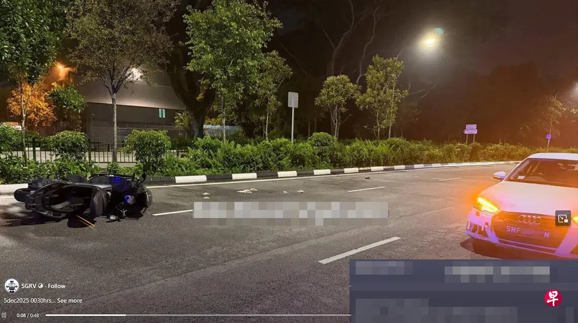 根据脸书专页SGRV的贴文,一辆黑色电单车与一辆白色奥迪轿车发生碰撞后,电单车倒在最右侧车道,奥迪则停在最左侧,车头明显凹陷受损。