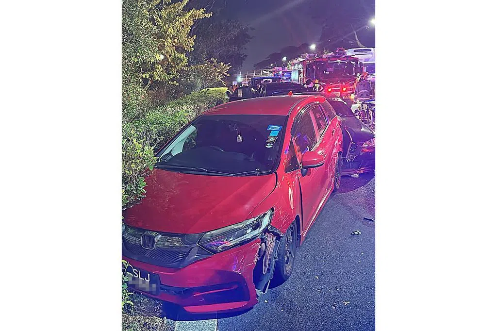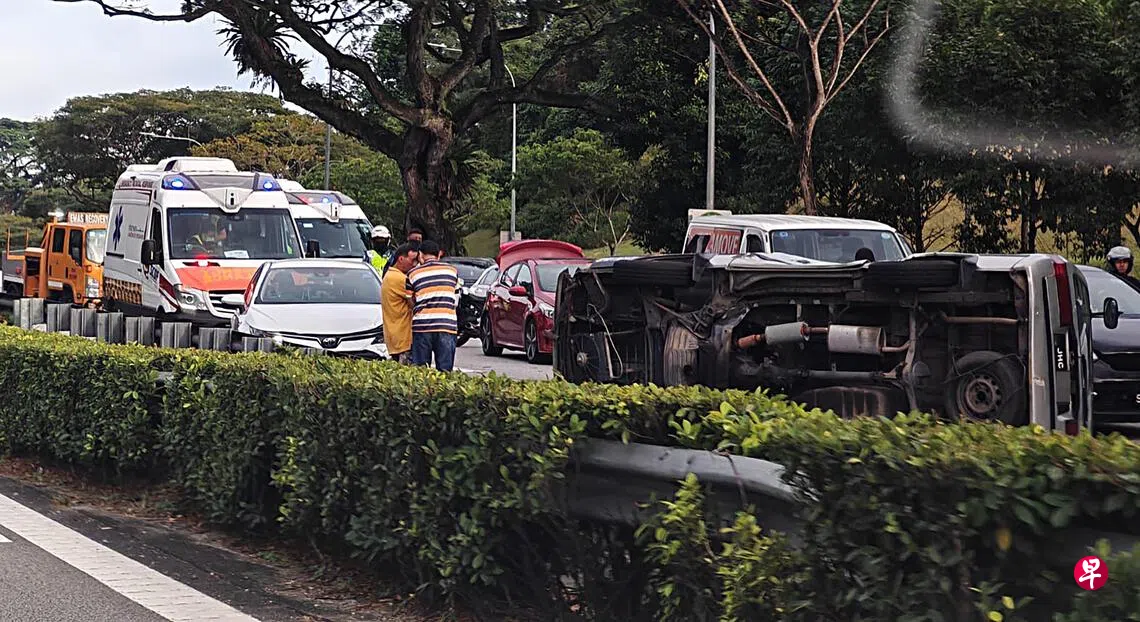 泛岛快速公路六车连环撞,一车侧翻,一名49岁电单车骑士受伤送院,导致交通大阻塞。