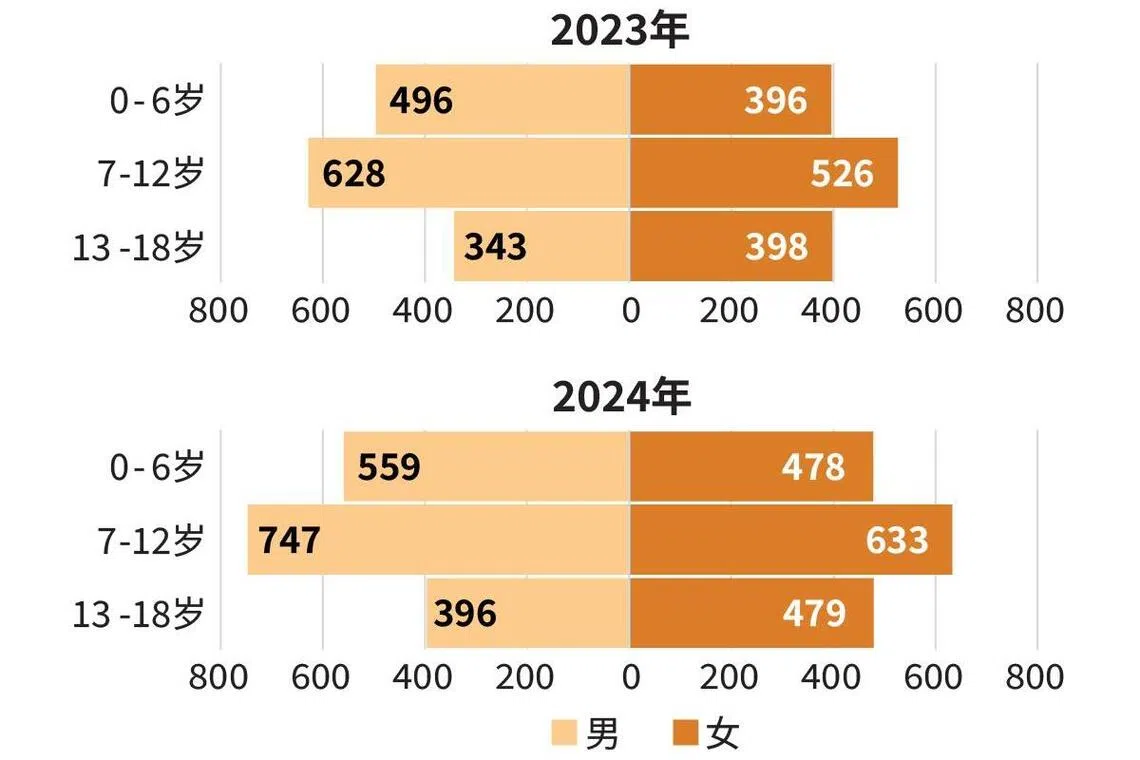 在性别分布上,7岁至12岁男童的个案数量高于女童。数据显示,2024年男童个案有747起,女童633起,2023年男童个案有628起,女童526起。