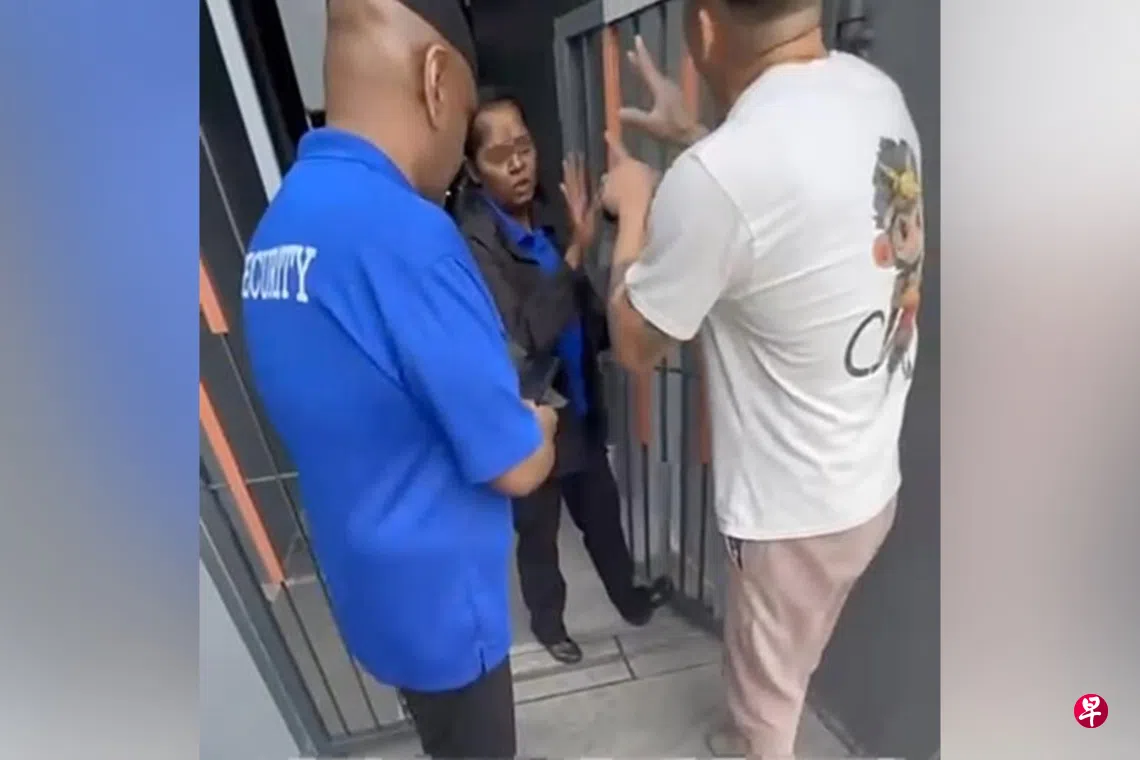 社交媒体近日流传一段视频,一名相信来自运输公司的男子与一名女保安在公寓门外起争执。