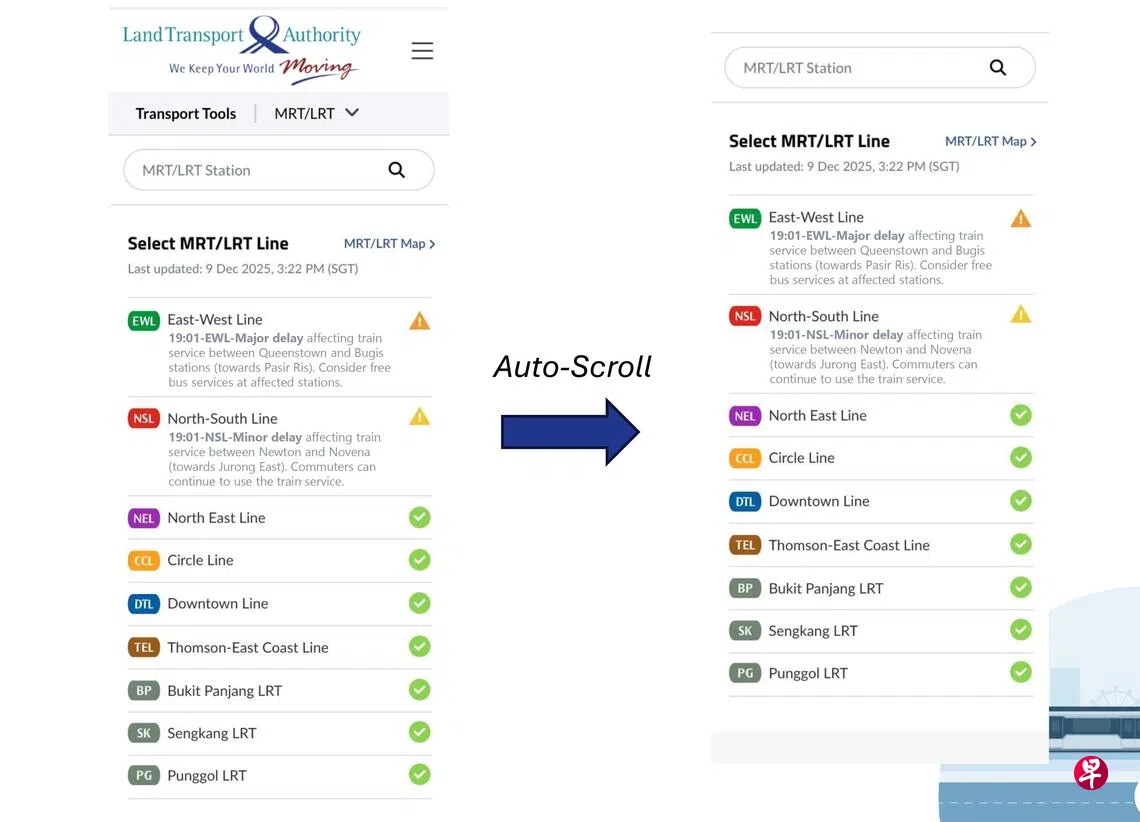 陆交局星期五(12月12日)发文告宣布推出新网页(mytransport.sg/trainstatus),即时更新所有地铁和轻轨系统的运作状态。公众可从星期六傍晚6时起使用网页。