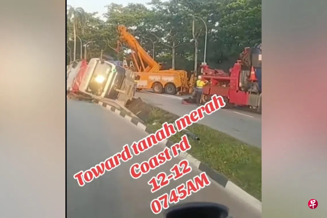 新加坡警察部队受询时证实,警方在星期五(12月12日)凌晨3时零5分许接获通报,指往樟宜机场方向的ECP,在通往丹那美拉海岸路的支路上发生一起疑自卸卡车失控打滑而侧翻的交通意外。