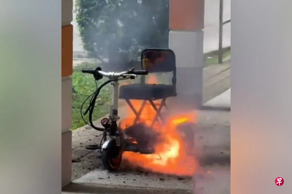 一辆行动辅助工具在后港组屋有盖走道上起火,公众见状利用灭火器灭火,无人在这起事故中受伤。