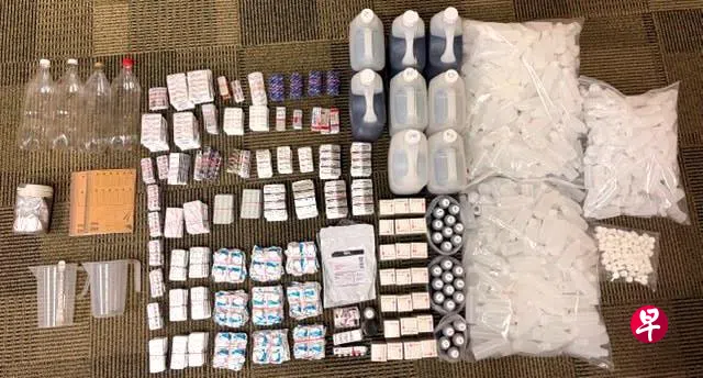 当局在行动中查获超过31公升非法咳嗽药水、5200余件强效处方药及制药设备,这批药物原本计划在新加坡分销。一名55岁男嫌犯在行动中被捕,他事后坦承非法制作咳嗽药水。