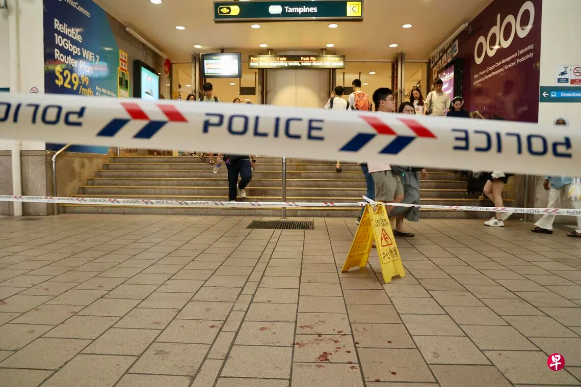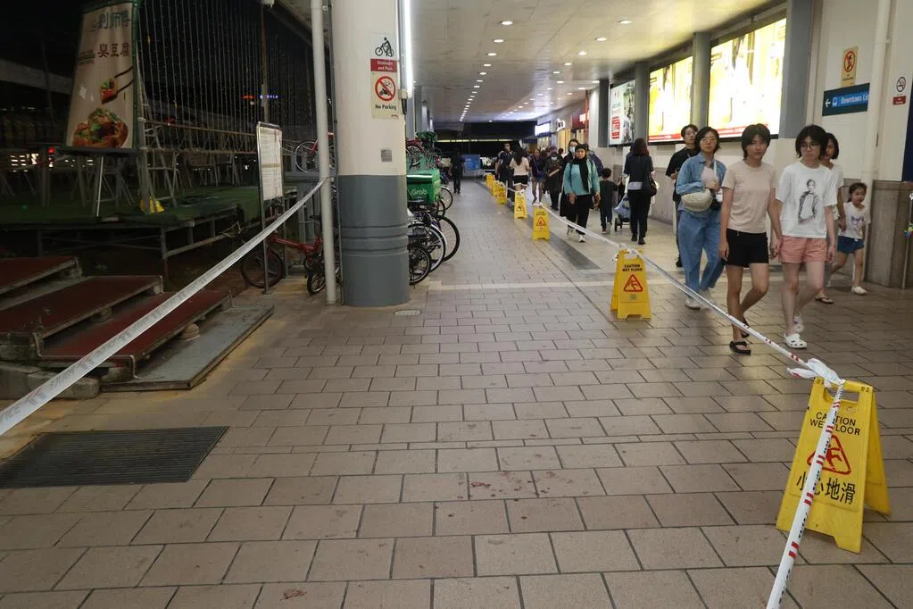 《联合早报》记者星期五晚上7时许抵达现场时,警方已在案发地点周围设起封锁线,地面上还有清晰可见的滴滴血迹,路上人来人往,但无人驻足围观。据观察,血迹从地铁站外一家咖啡店开始出现,一路延至路口的红绿灯处,全长约50米左右。