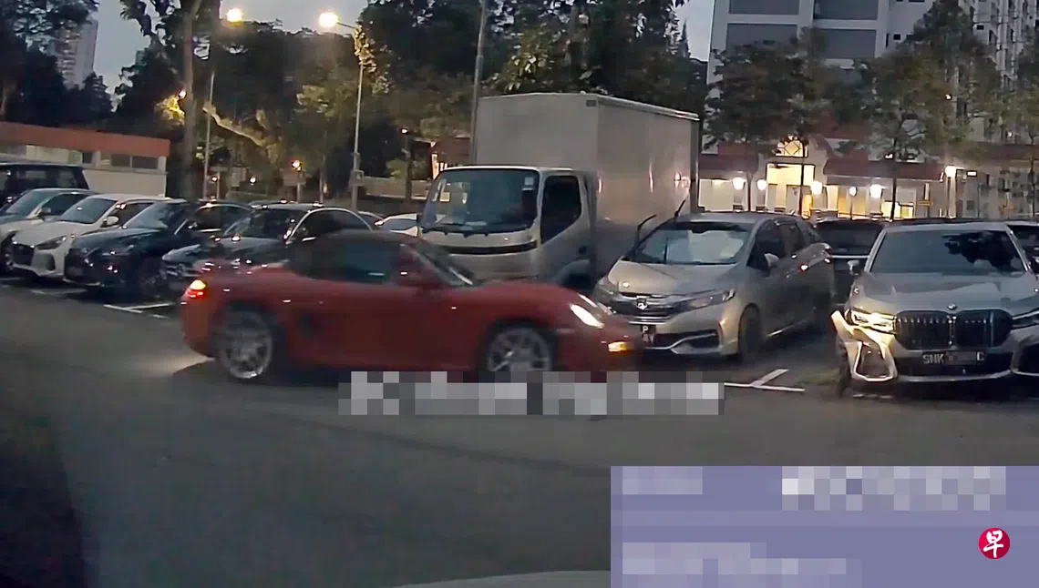 根据脸书群组SGRV上传的视频,一辆红色保时捷Boxster跑车倒车相信要离开时,竟撞上停在一旁的一辆罗厘和另一辆宝马汽车。