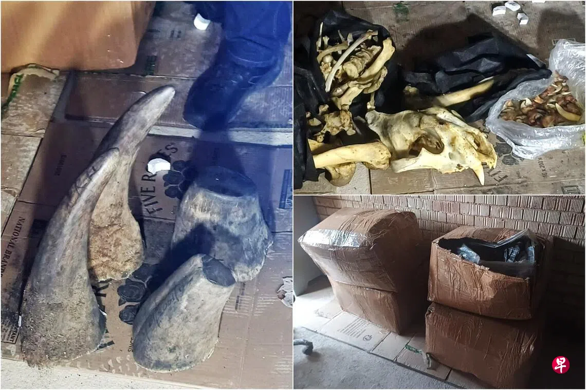 新加坡与南非联手侦破野生动物走私案,起获55.4公斤犀牛角,以及26.2公斤狮子和老虎骨骼、头骨及爪子,两名尼日利亚男子落网。