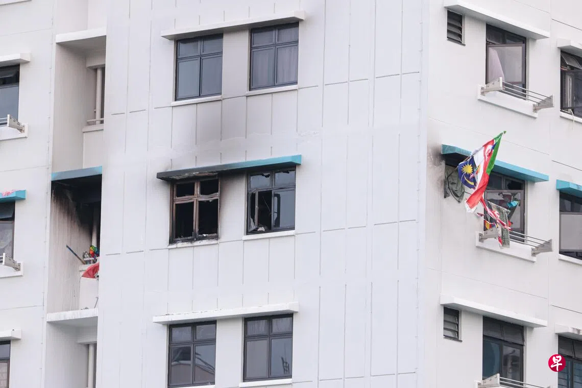《联合早报》摄影记者拍下的现场照片显示,起火单位的外墙明显熏黑,窗户也破裂。