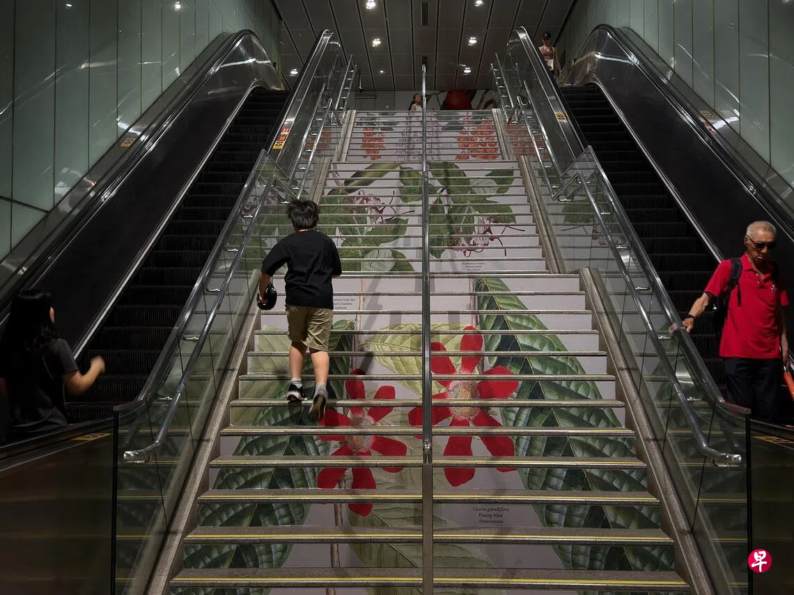 植物园站是环线和滨海市区线的转换站。《联合早报》摄影记者走访地铁站时发现,从地铁转换层一路到地铁站出入口,墙面与地面皆可见不同水果植物的画作。