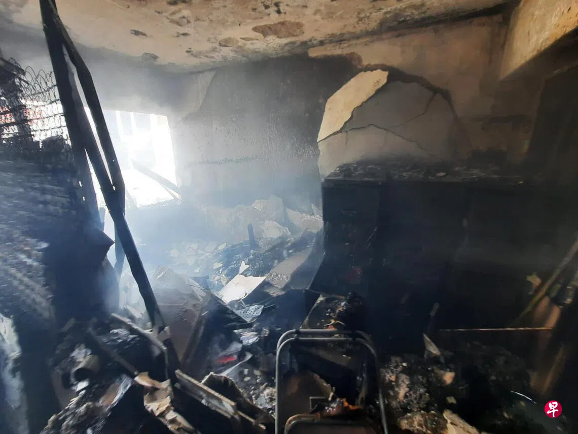 民防人员赶到现场时,单位客厅的火仍在狂烧,消防员破门而入并使用两支水柱灭火。当时单位内没有人。