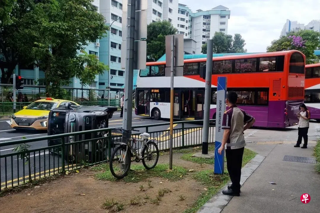 小红书用户Cargo星期二(1月6日)早上8时12分发布照片,显示一辆黑色本田小货车侧翻在左边车道。一辆非载客的新捷运巴士停在路口中央,巴士的两道车门都开着。多名新捷运工作人员也站在车祸现场周围。
