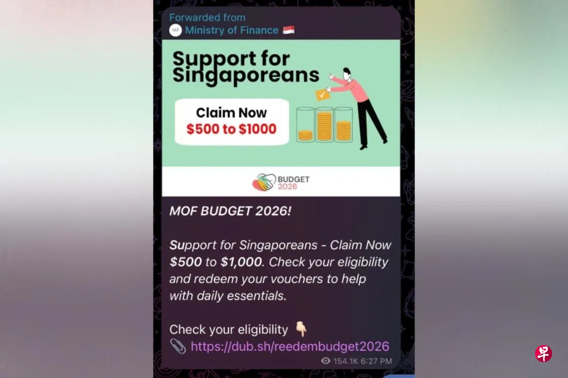 财政部星期三(1月7日)发贴文提醒公众,留意有关社区发展理事会邻里购物券和2026年财政预算案的虚假链接。财政部说,政府机构官员不会要求公众透露银行户口资料,或要求公众转账。公众在领取政府补助时应注意,只使用政府机构官方网站。领取社理会邻里购物券时,应通过网站go.gov.sg/cdcv,使用Singpass登录。