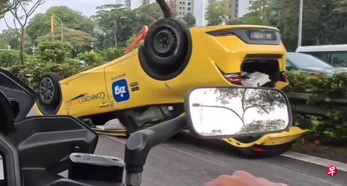 根据网上流传的视频,翻覆的黄色康福德高德士占据了最右边车道,汽车的后备箱也被打开。两辆交警电单车和一辆拖车停在不远处,查案人员正在展开调查。