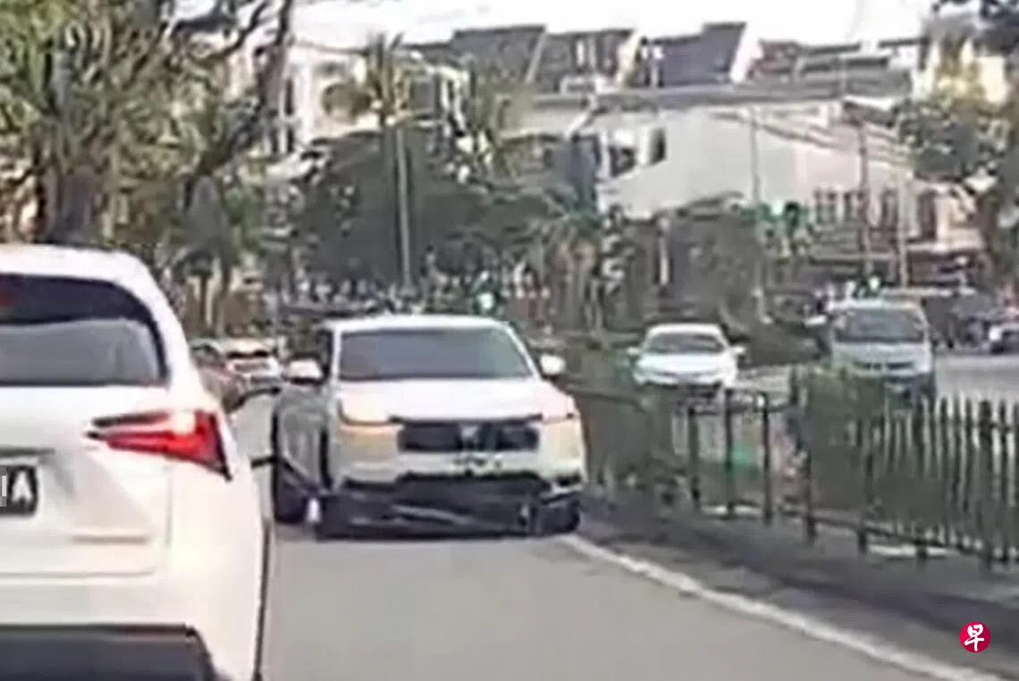 根据网络视频,一辆白色本田汽车刚驶过红绿灯,切到旁边车道后失控,径直撞向路中央的分界堤围栏。