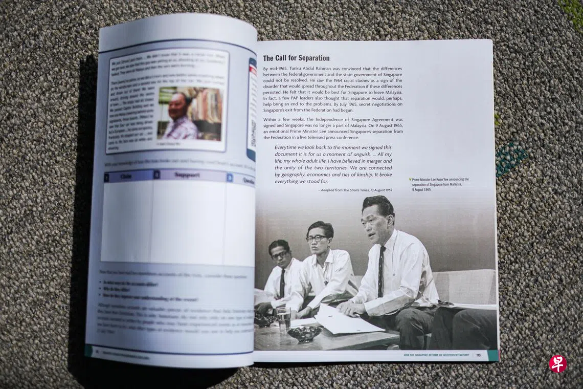 教育部长李智陞星期一(1月12日)书面答复裕廊东—武吉巴督集选区议员许德财就《信天翁档案》材料将如何融入学校历史、社会知识(social studies)与国民教育的教材时说,学生在社会知识和历史课学习新加坡与马来西亚分家的历史。小学生在社会知识课中学习新加坡历史的关键发展片段,包括新加坡与马来西亚合并,以及分家。在中学低年级历史课,学生在基础上进一步认识新加坡于1945年至1965年走向独立的历程。