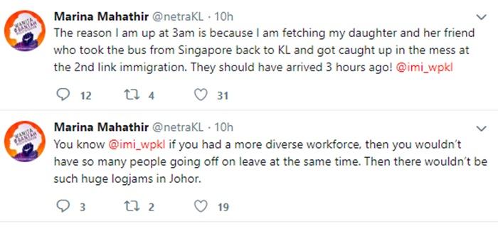 玛丽娜今天凌晨3时在推特批评马来西亚移民局的效率慢,导致她从新加坡乘搭巴士返回吉隆坡的女儿被迫卡在新马第二通道,最后慢了三个小时才回到吉隆坡。