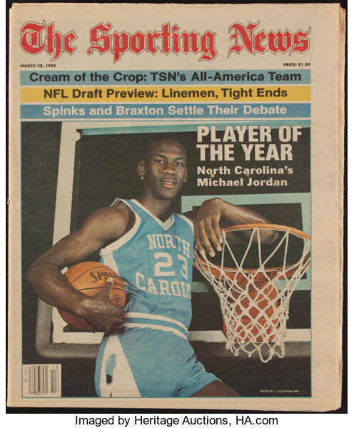 乔丹在大学时期效力于北卡大学,他曾穿着上述的蓝白色23号球衣,登上1983年3月的The Sporting News刊物封面。当时,他获选为美国大学体育协会(NCAA)年度最佳球员。