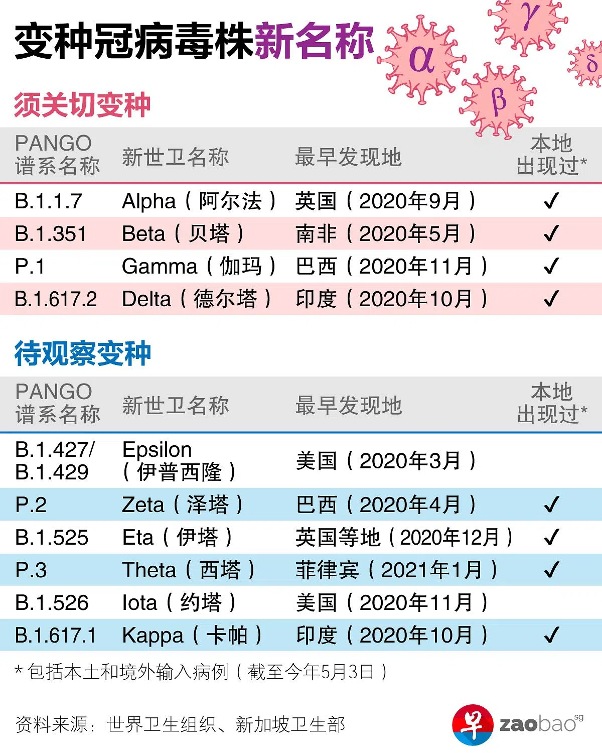 (早报讯)世界卫生组织(WHO)宣布,从现在开始,最早在一些国家发现的变种冠病病毒将改用希腊字母命名,这是为避免对相关国家造成污名化。