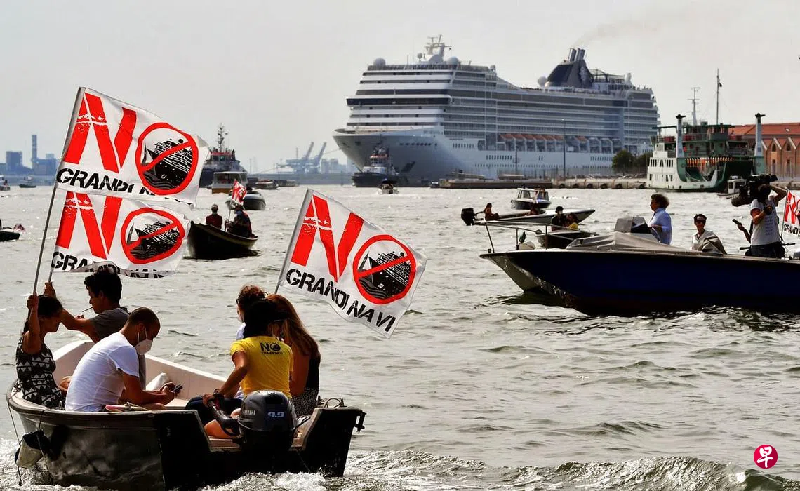 威尼斯部份居民多年来一直呼吁政府禁止大型游轮和船只穿越潟湖,停泊在知名景点圣马可广场附近。威尼斯海平面上升,建物水下结构备受侵蚀,居民担忧大船经过会加剧污染和侵蚀。