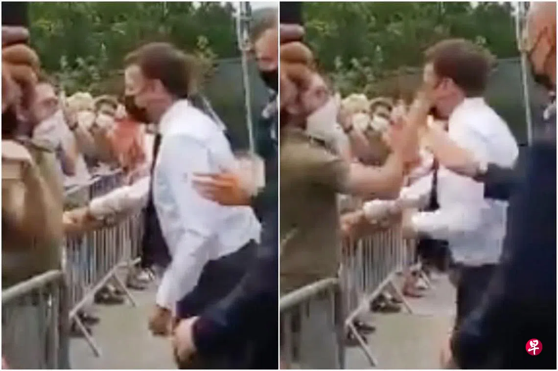 (早报讯)法国总统马克龙周二(6月8日)在走访法国南部地区时,遭一名围观男子打了一记耳光。