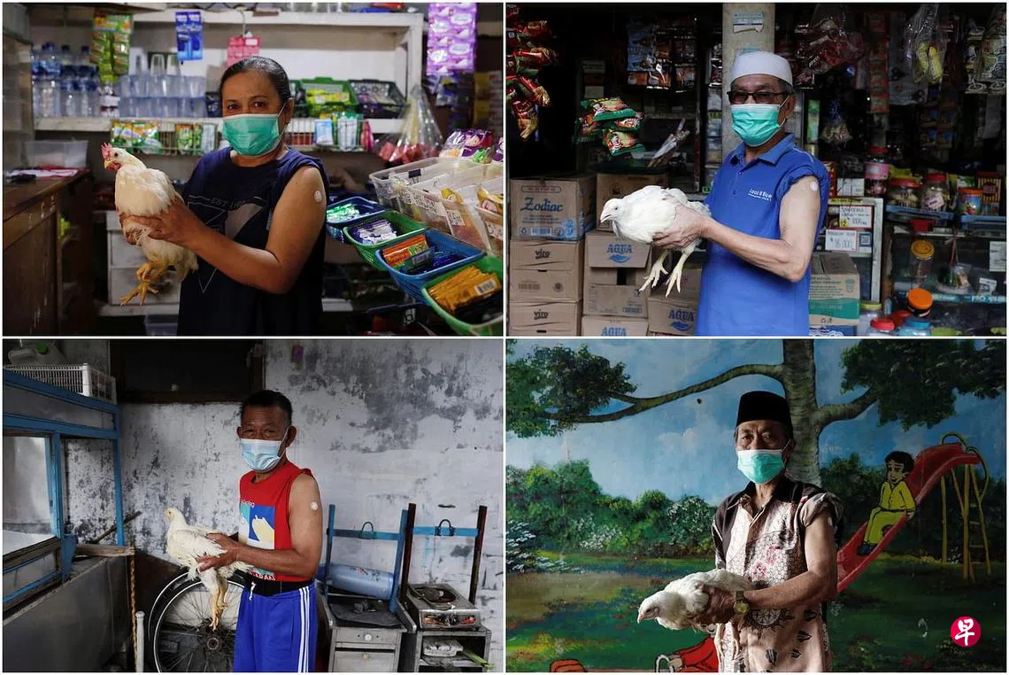 (早报讯)印尼农村地区的地方政府为鼓励年长居民接种冠病疫苗,想出了赠送活鸡的办法。