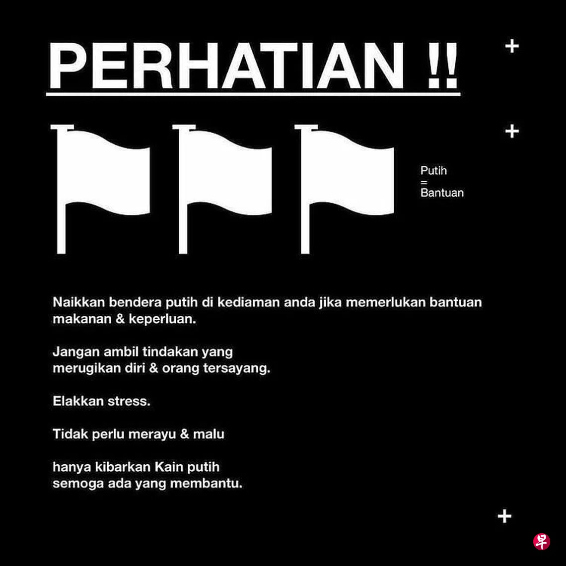 星洲网报道,人民发起这项“举白旗运动”,借此呼吁有需要帮助者在住家显眼的地方竖起白旗,让邻居或附近有能力人士看到该旗帜,并且帮助渡过难关。