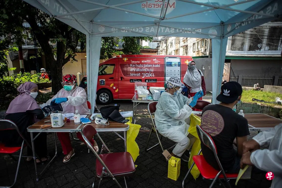 (早报讯)印度尼西亚冠病疫情严峻,首都雅加达当局派遣医疗人员开车到拥挤、难以进入的地区为社区民众接种疫苗。