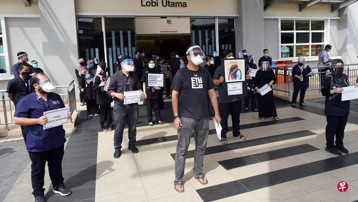(早报讯)马来西亚玻璃市加央端姑傅芝雅医院今天(7月26日)约50名合约医生在B座医疗大楼前,进行“合约医生罢工”行动。