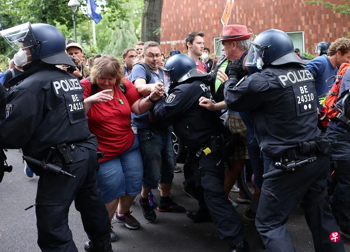 (早报讯)在反防疫措施团体“横向思维”运动号召发起下,数以千计反对防疫封城的德国民众,星期日(8月1日)不顾法院裁定的抗争禁令聚集柏林街头,并与警方爆发冲突。法新社报道,警方表示,若干抗议民众“骚扰及攻击”警员,并且恣意跨越路障,造成柏林市部分地区交通陷入混乱,逾500人因此被捕。