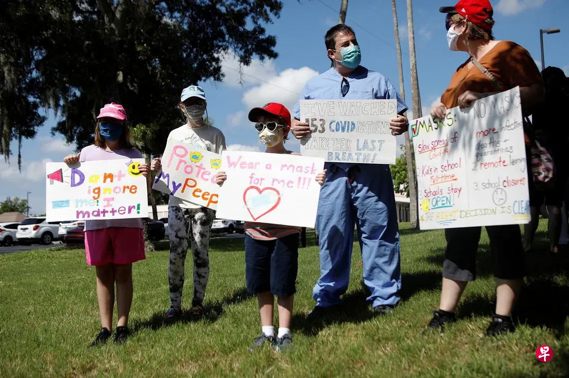 (早报讯)美国冠病疫苗接种率低的保守派地区确诊病例不断激增,佛罗里达州和得克萨斯州学区无视共和党籍州长的禁令,相继宣布学生和教师必须戴口罩。
