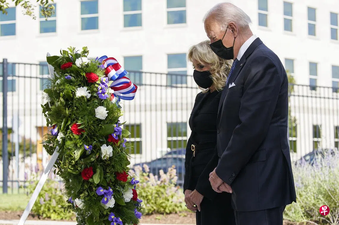 (早报讯)九一一恐怖袭击事件20周年,美国总统拜登及第一夫人吉尔星期六(9月11日)分别前往当年三处坠机地点,即纽约市世贸中心双子塔、宾夕凡尼亚州尚克斯维尔,以及华盛顿五角大楼,悼念遇难者。